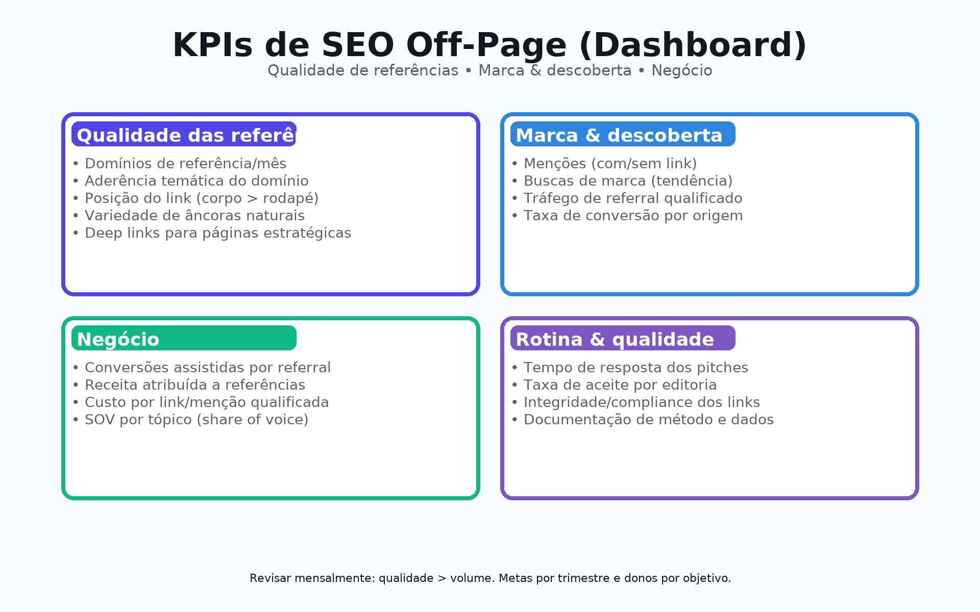 | Descoberta & marca | Menções (com/sem link), buscas de marca, tráfego de referral qualificado | Transformar menções em link quando fizer sentido; crescimento de SOV por tópico |
